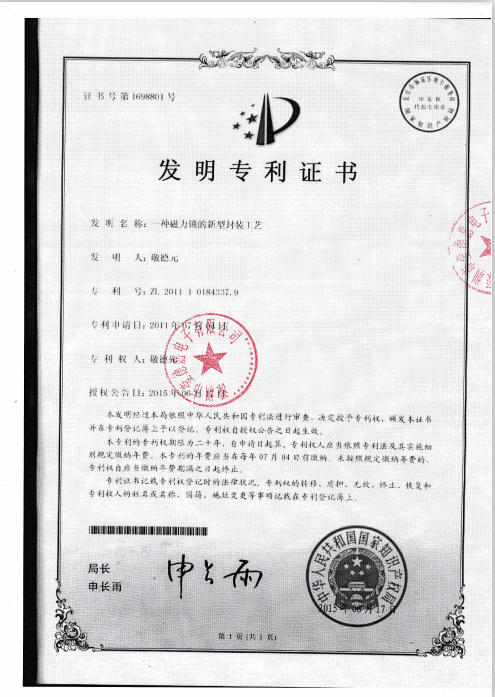 磁力锁生产工艺专利发明证书